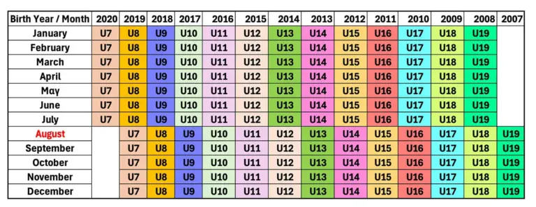 Seasonal Year age groups use August 1st to July 31st birthdays,